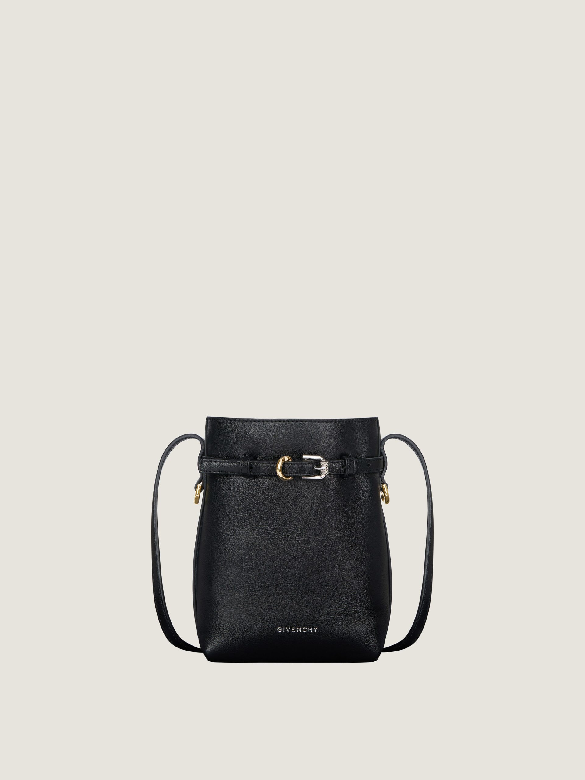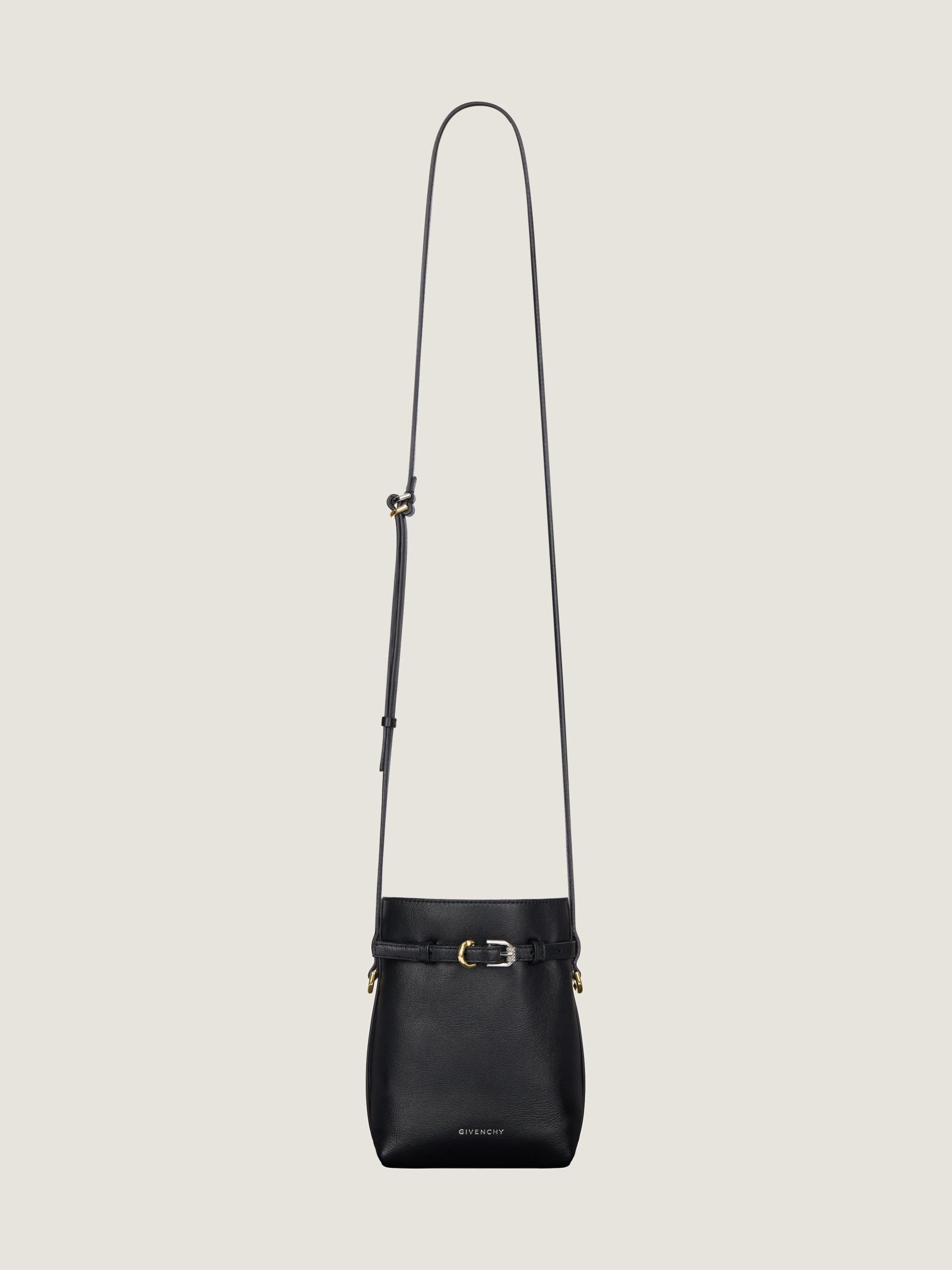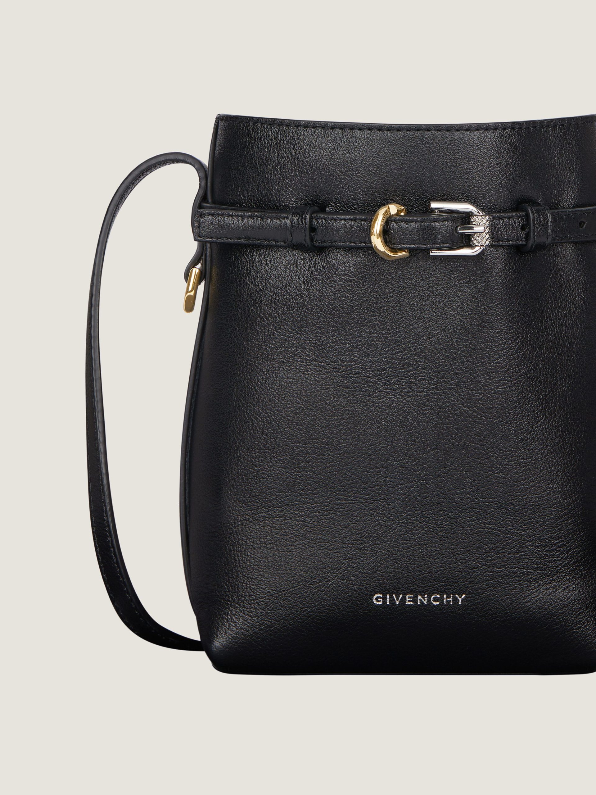 - Adjustable leather strap with GIVENCHY engraved metal buckles on the front.