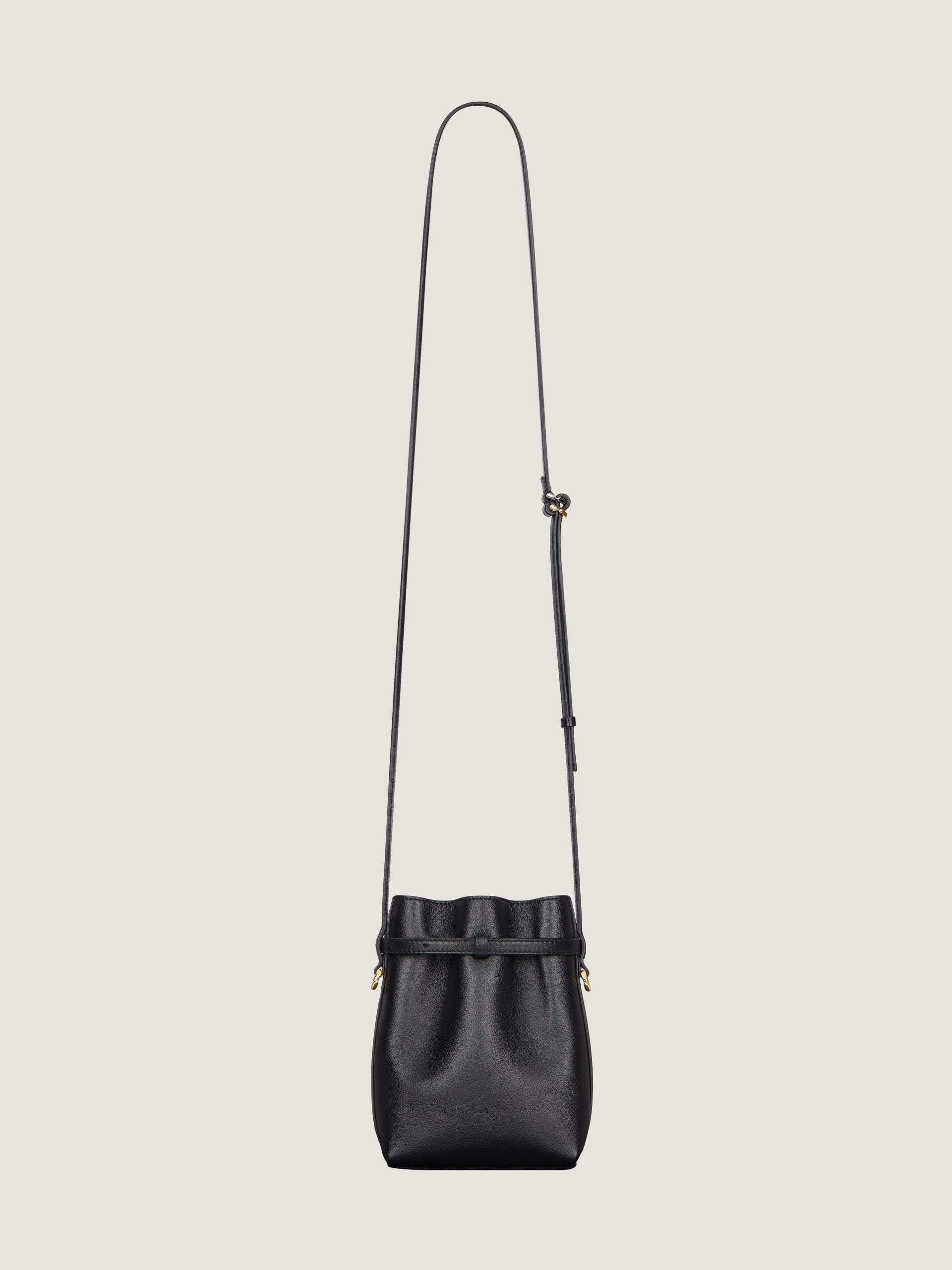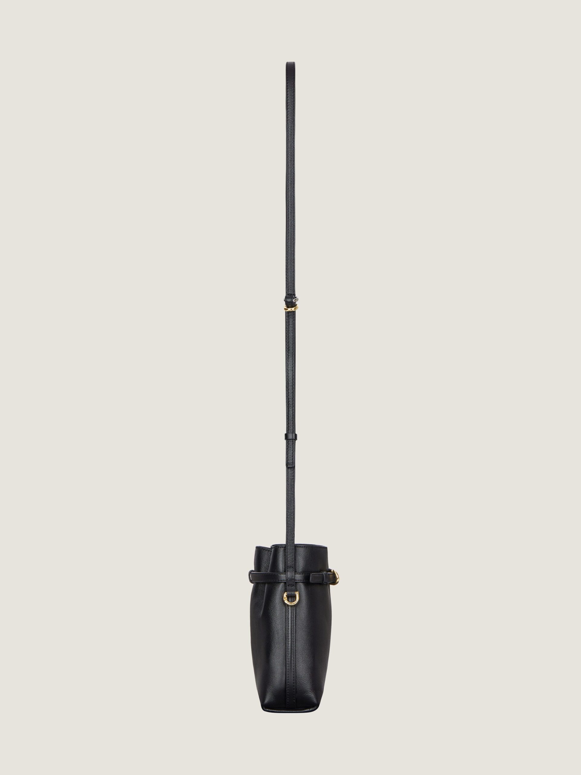 - Thin leather strap allowing crossbody carrying.