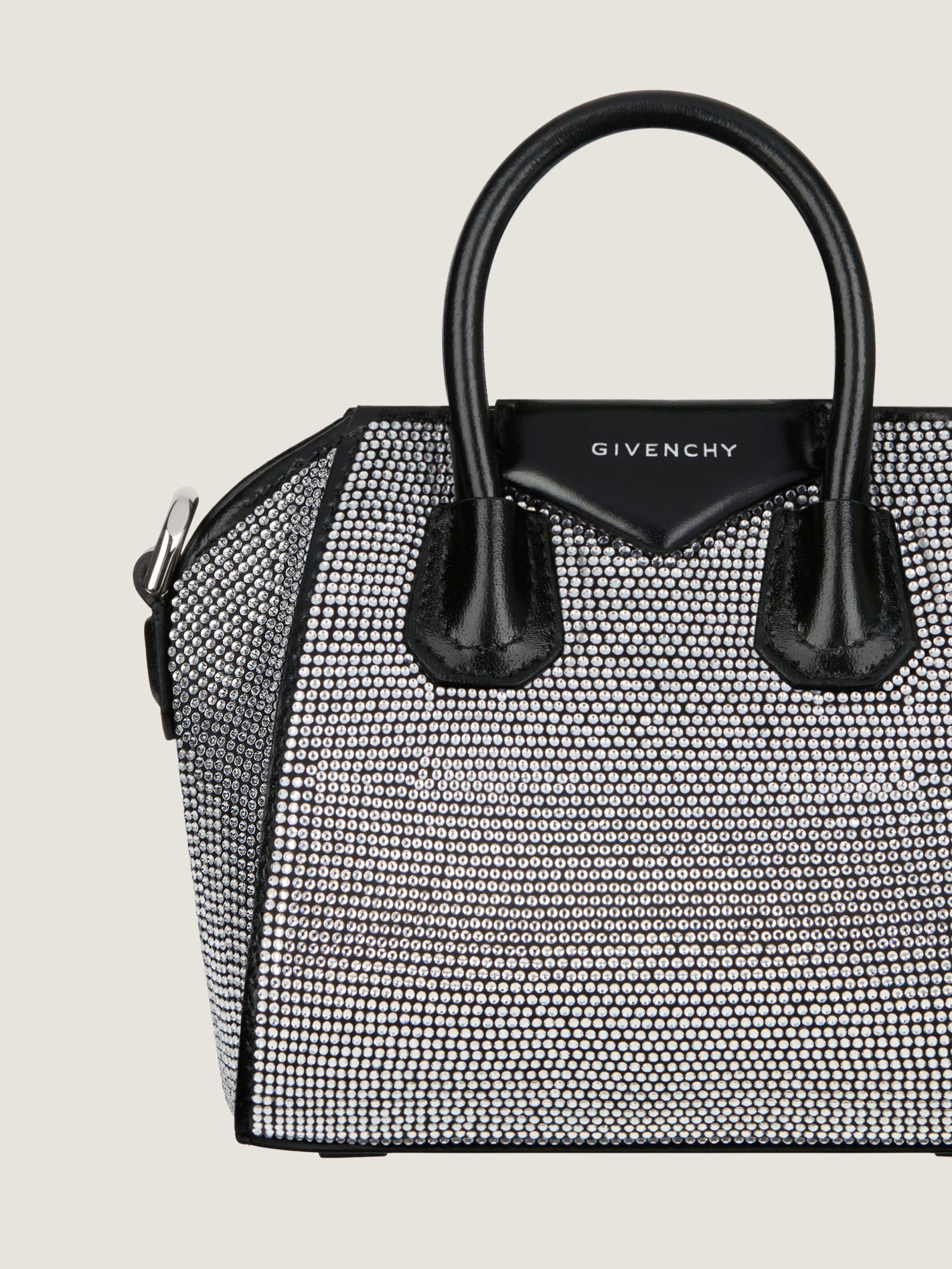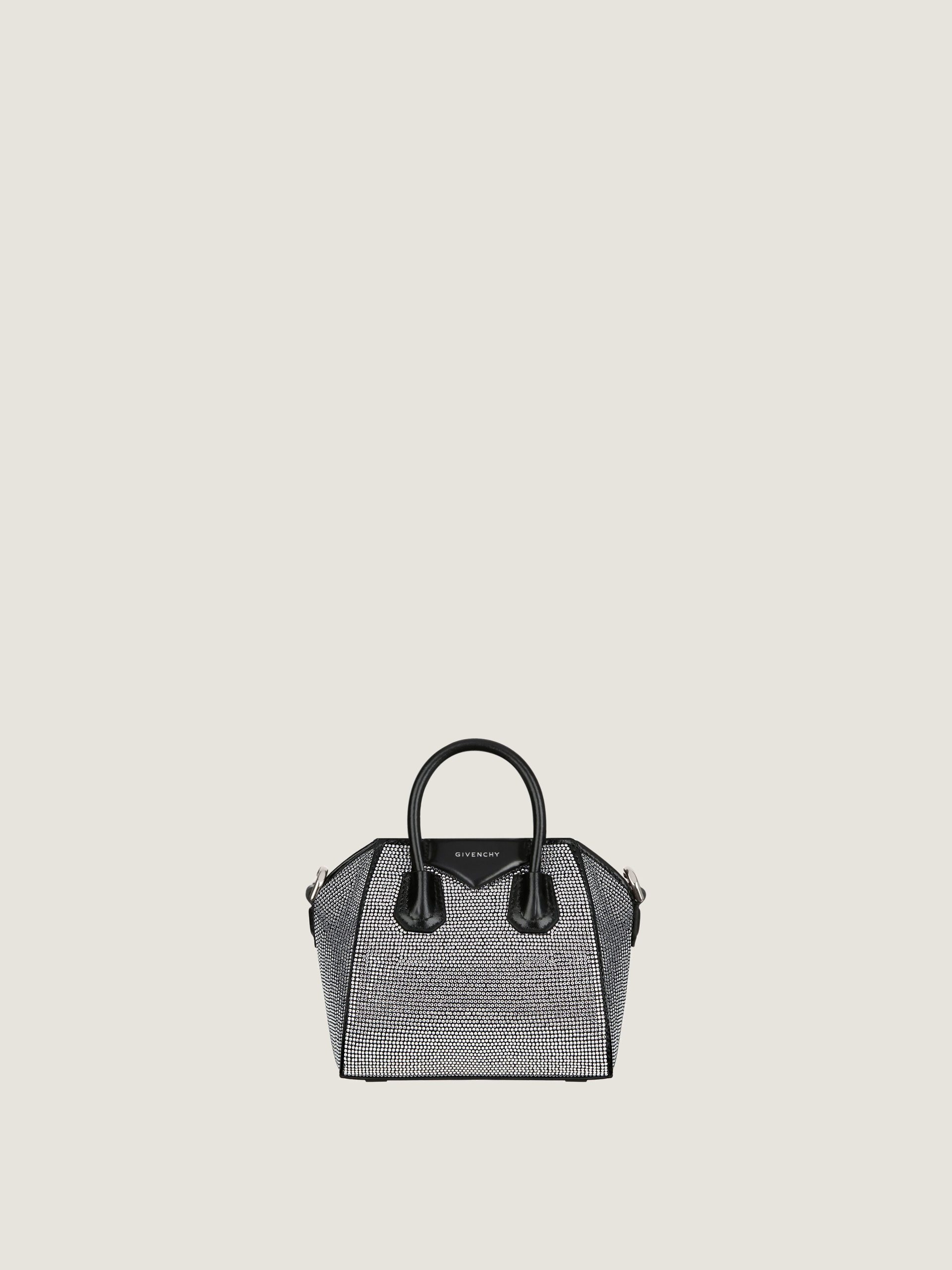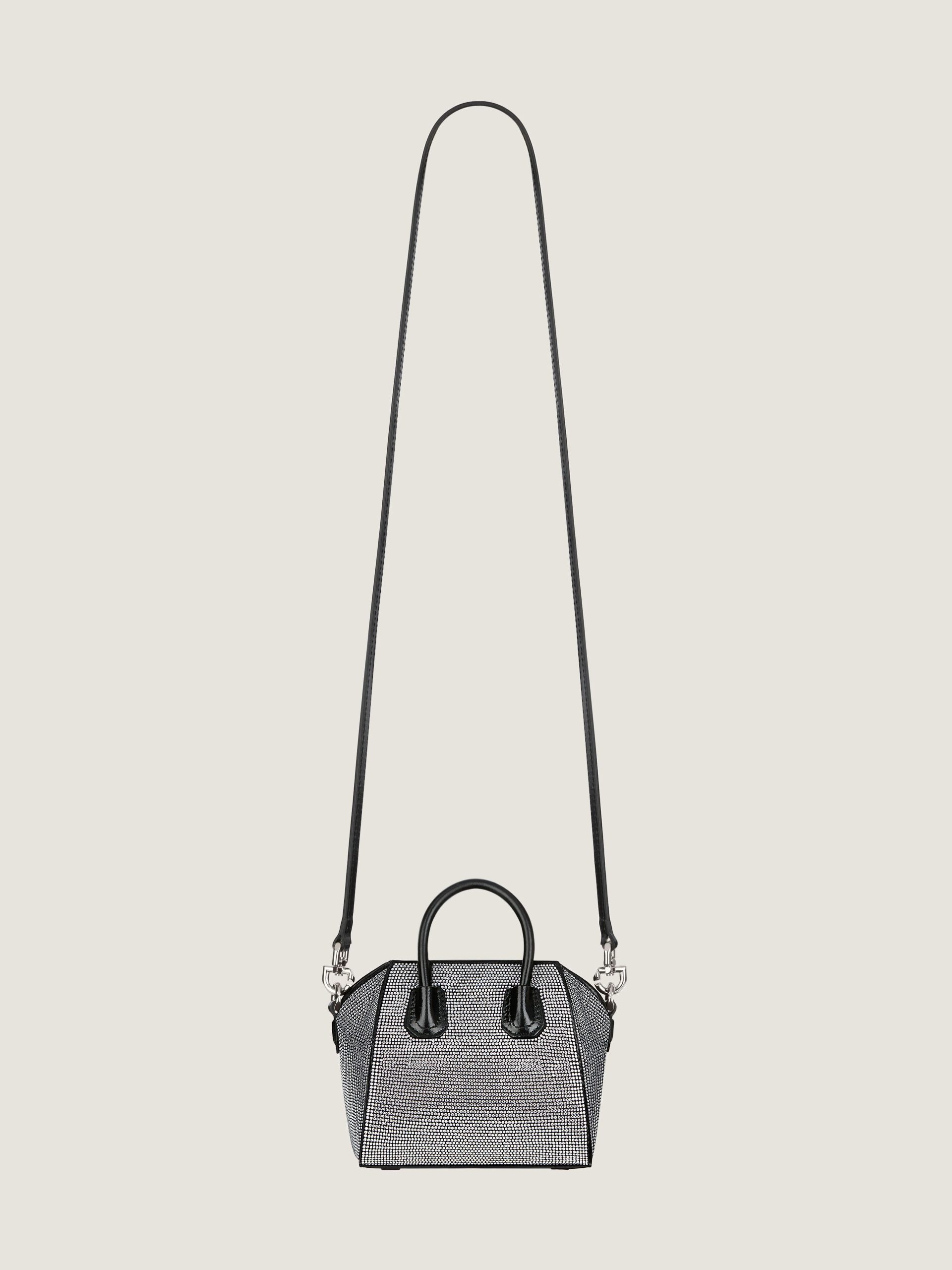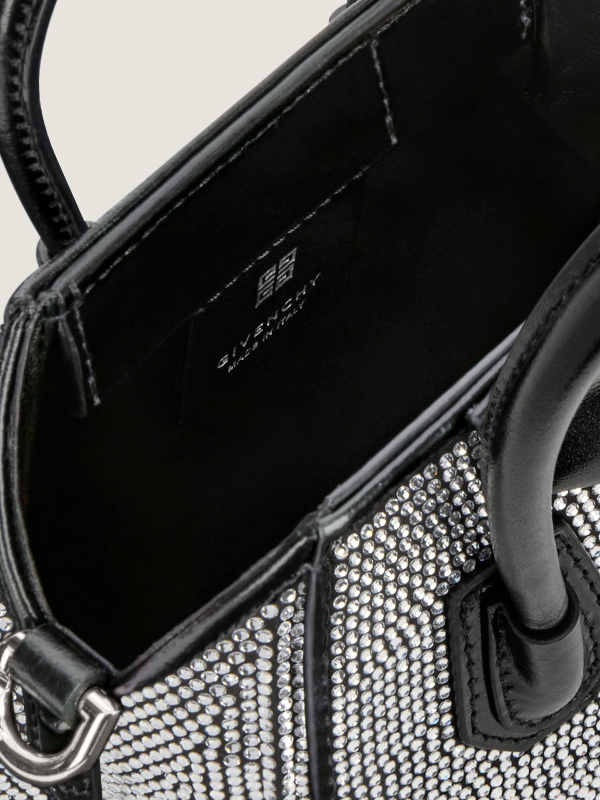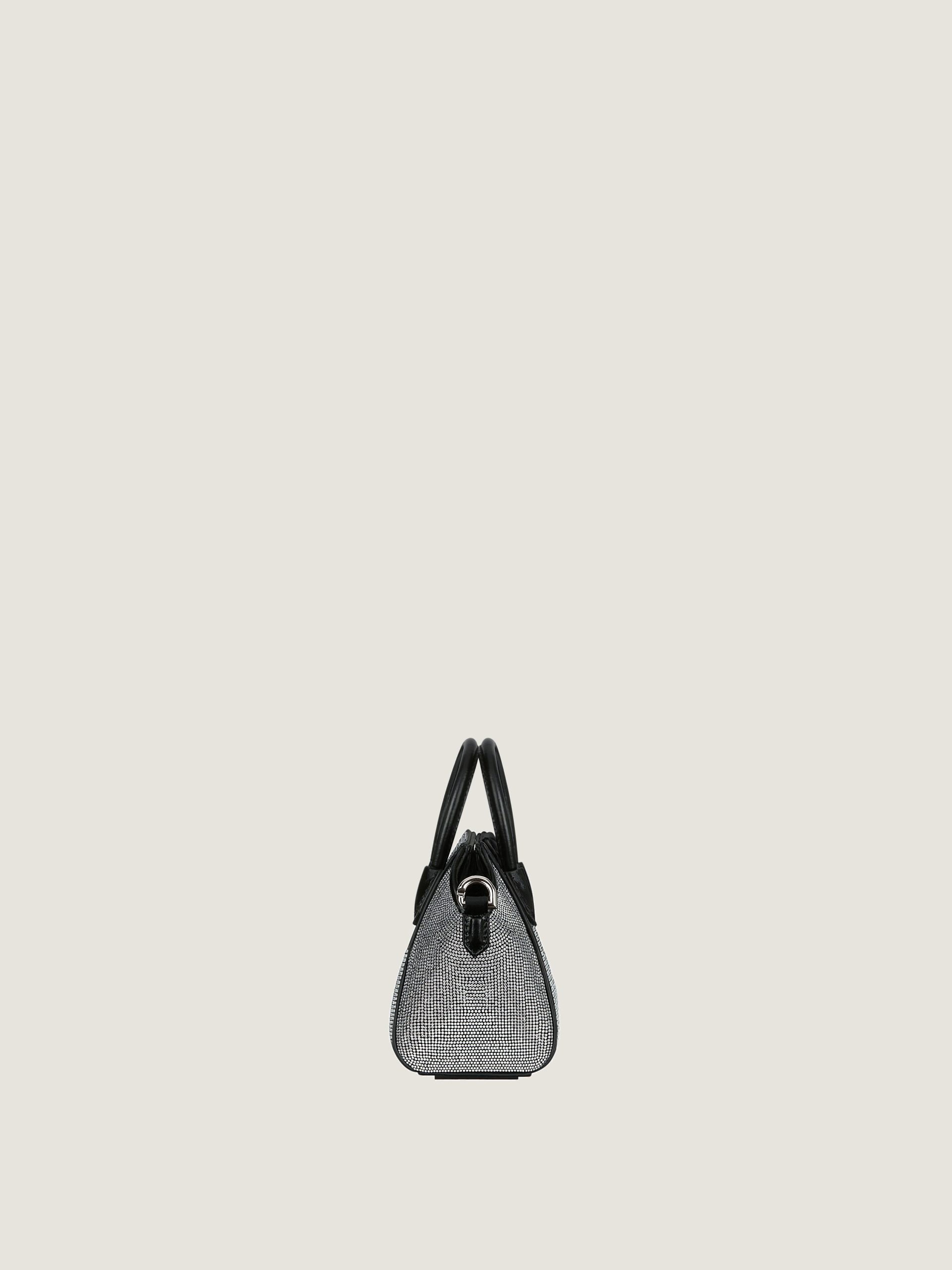 - Micro handbag or crossbody bag in satin covered with all-over strass.