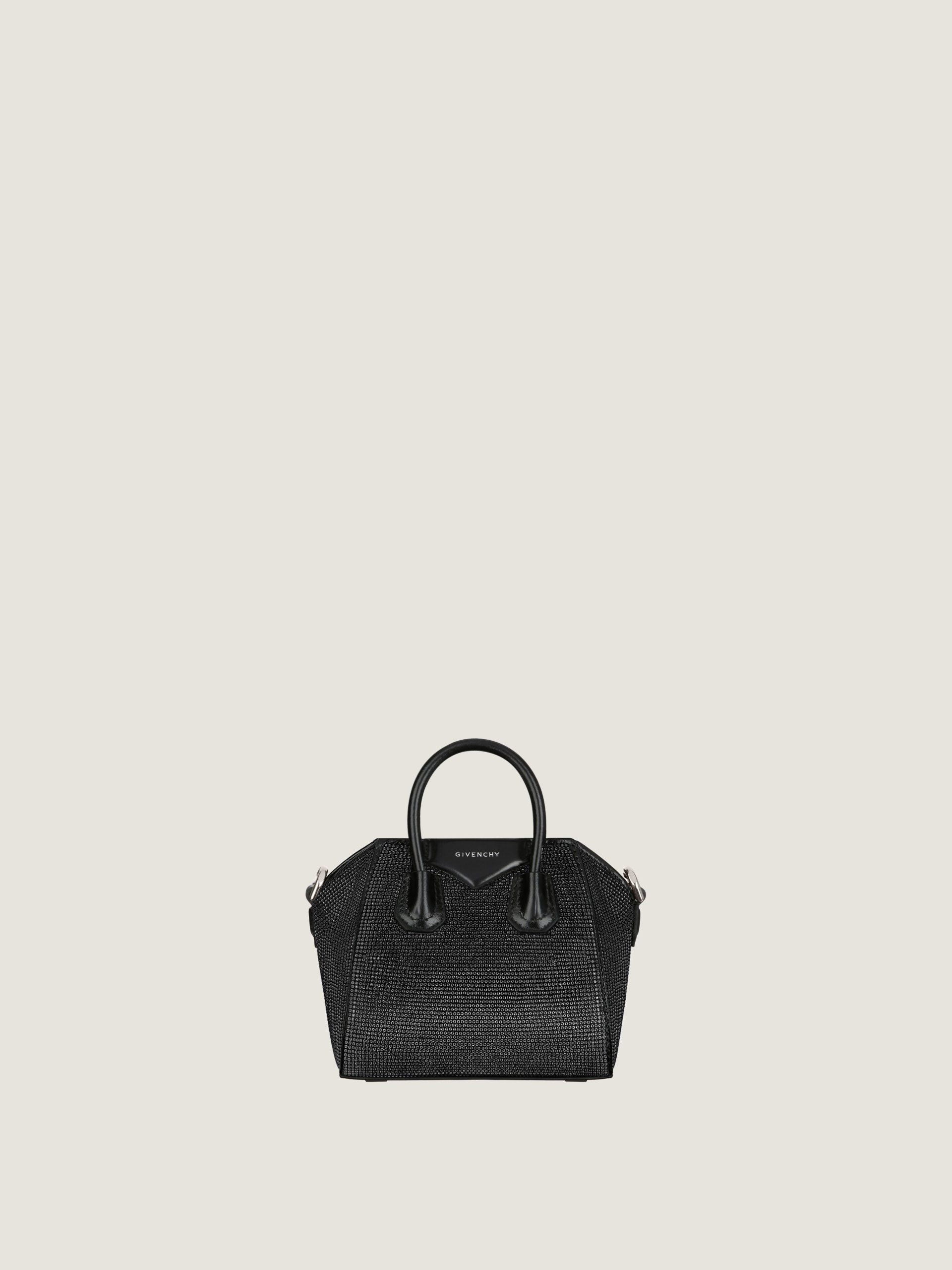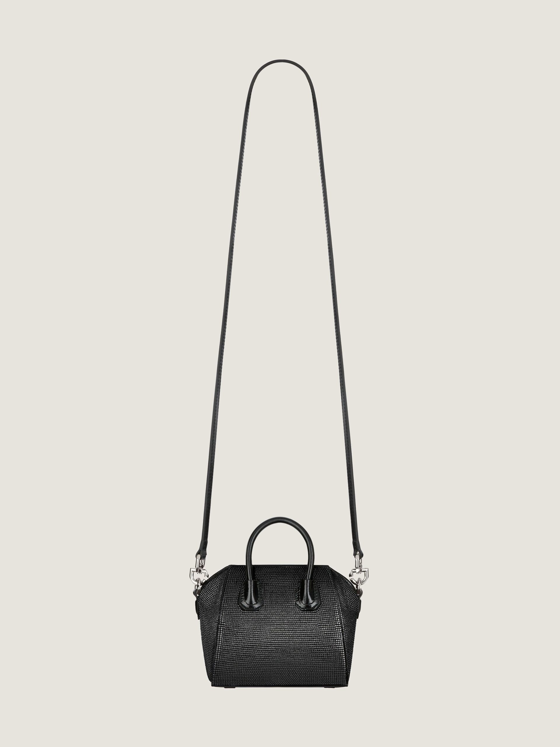- Micro handbag or crossbody bag in satin covered with all-over strass.