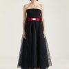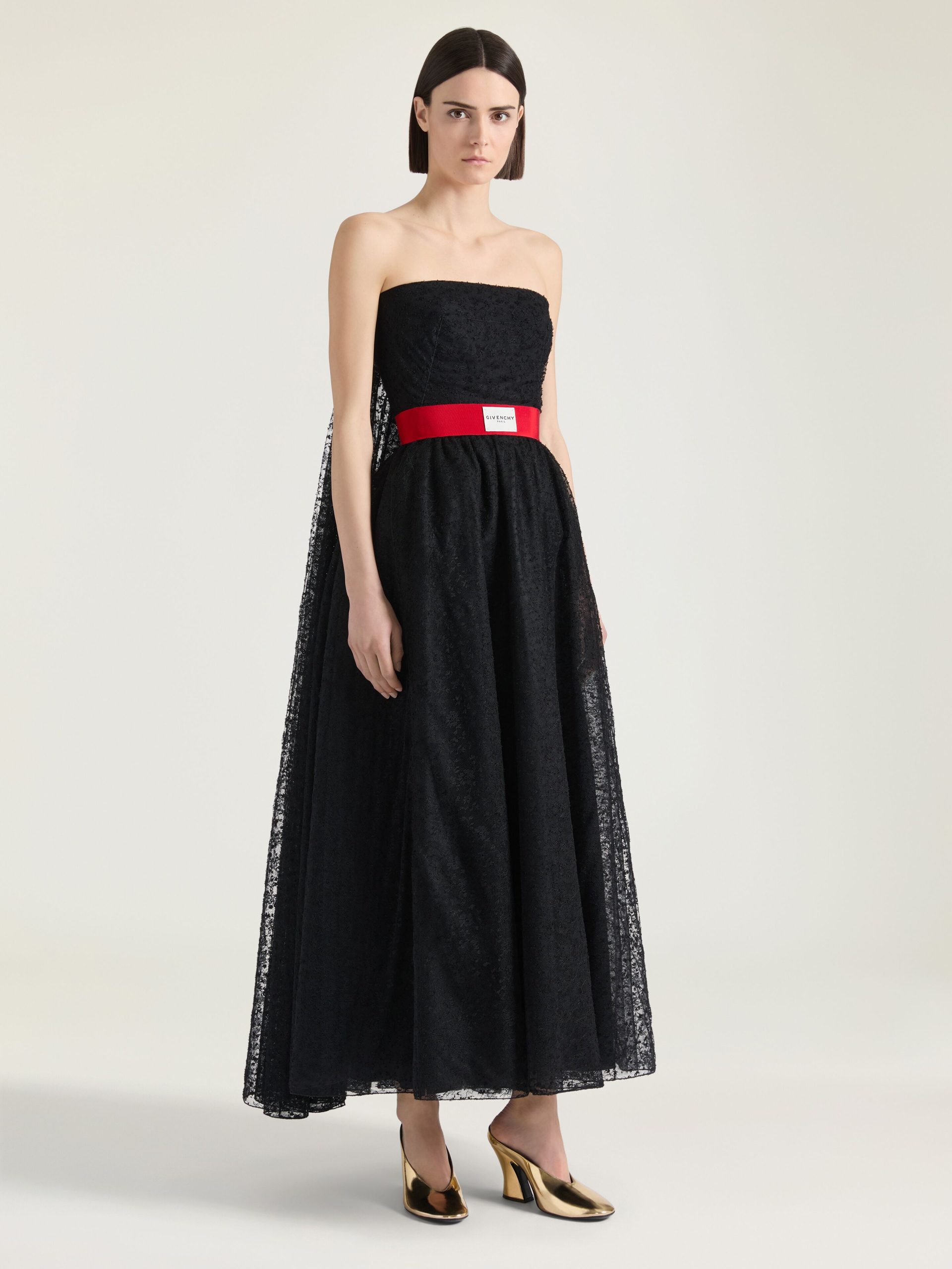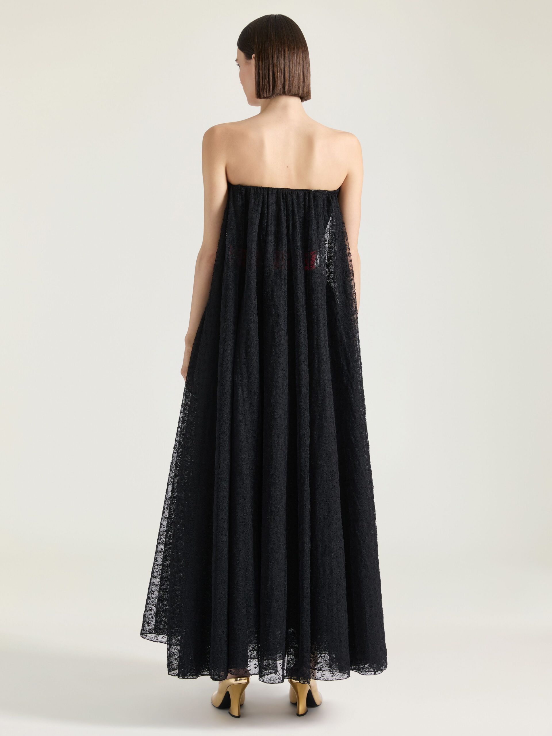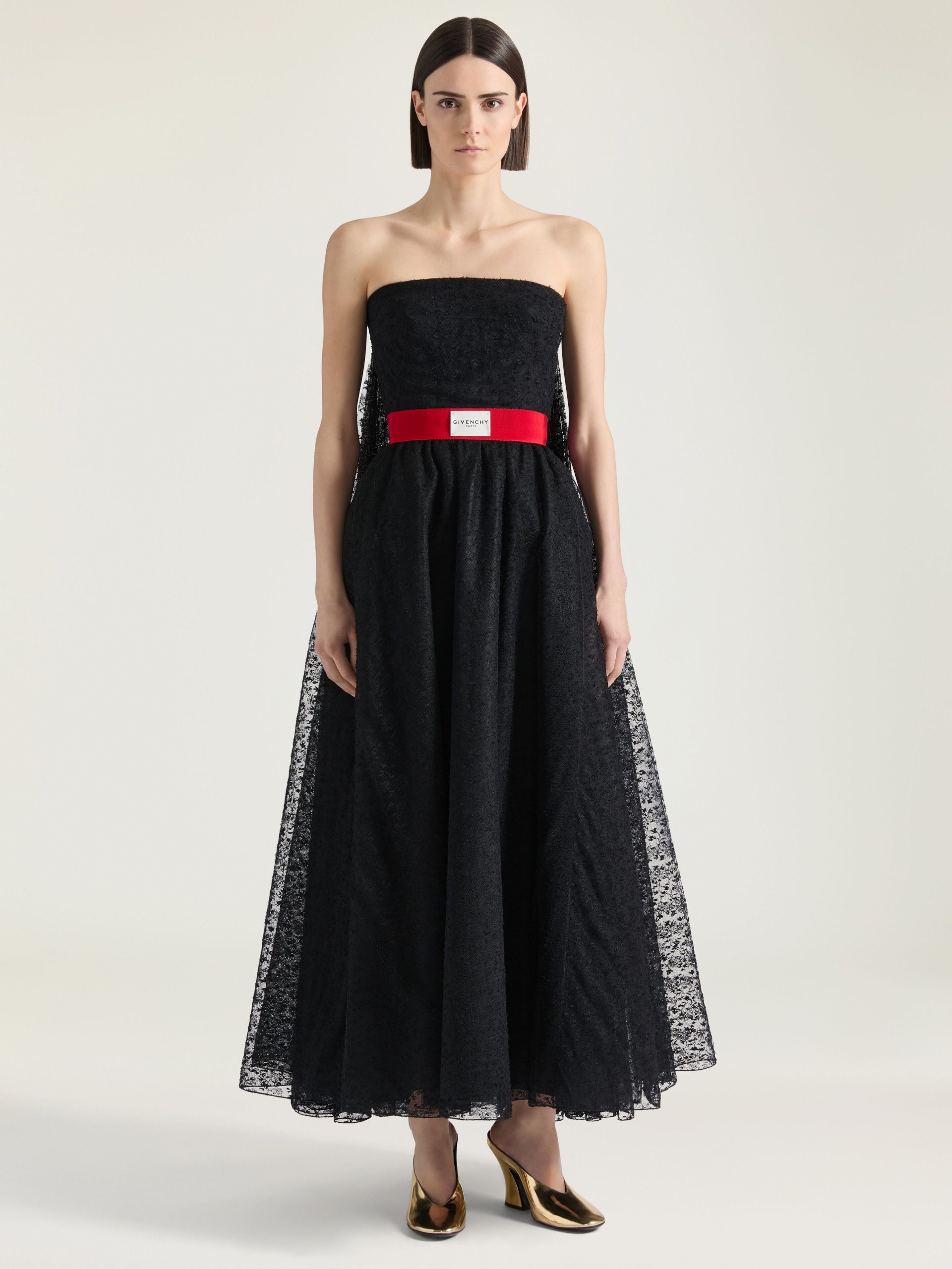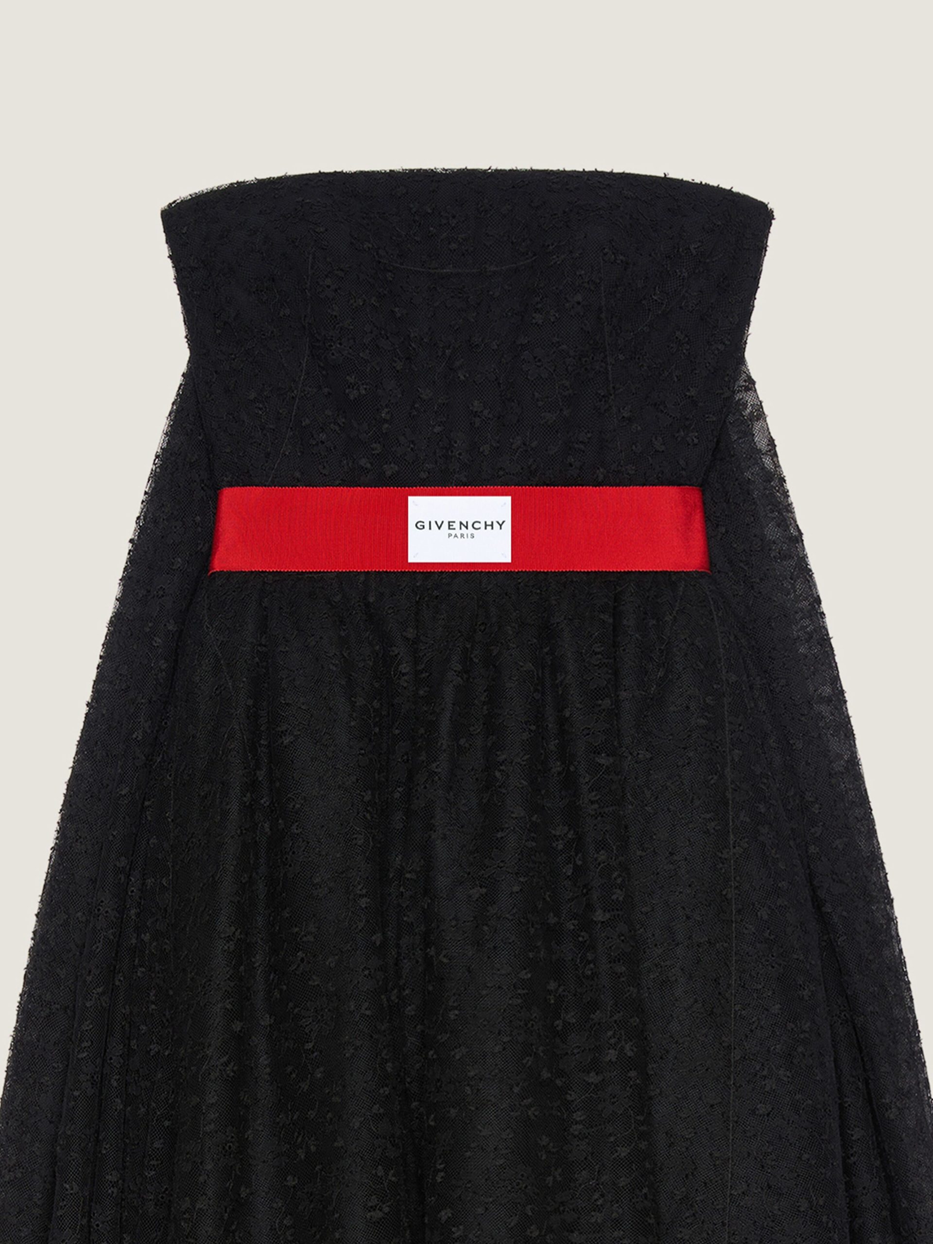 - Mid-length bustier evening dress in lace.