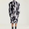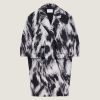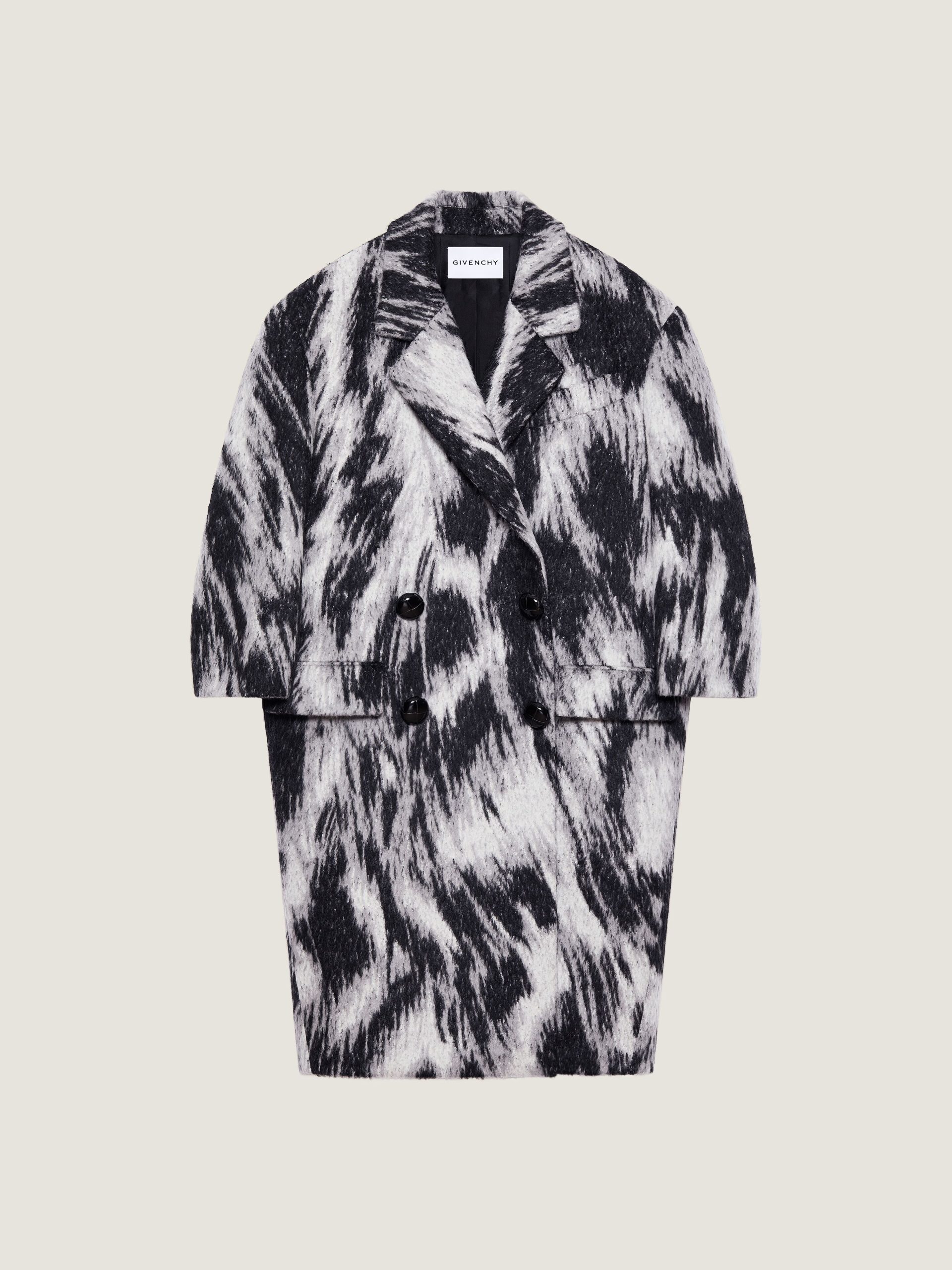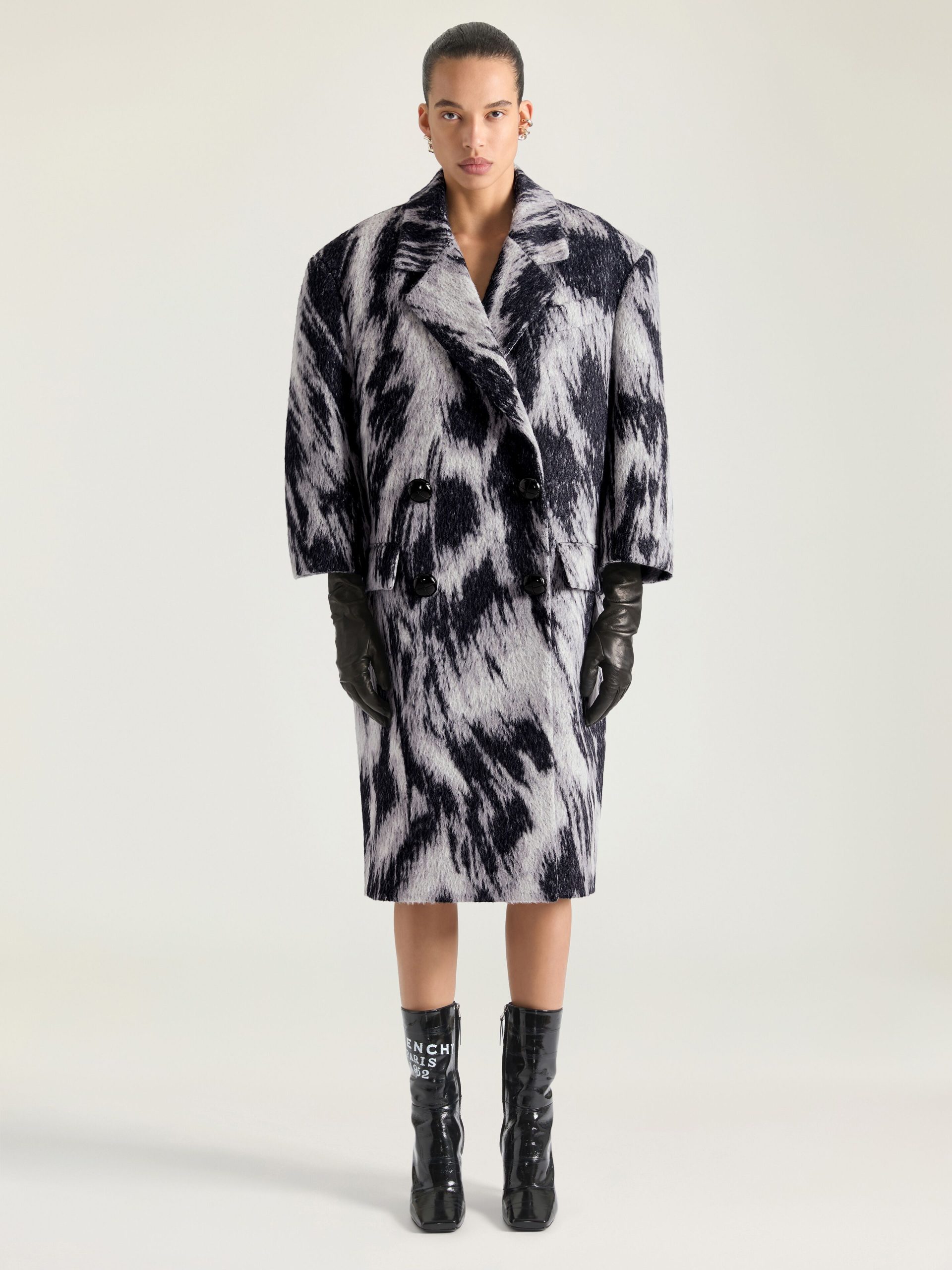 - Three-quarter sleeved coat in wool and baby llama hairs jacquard.