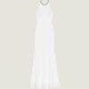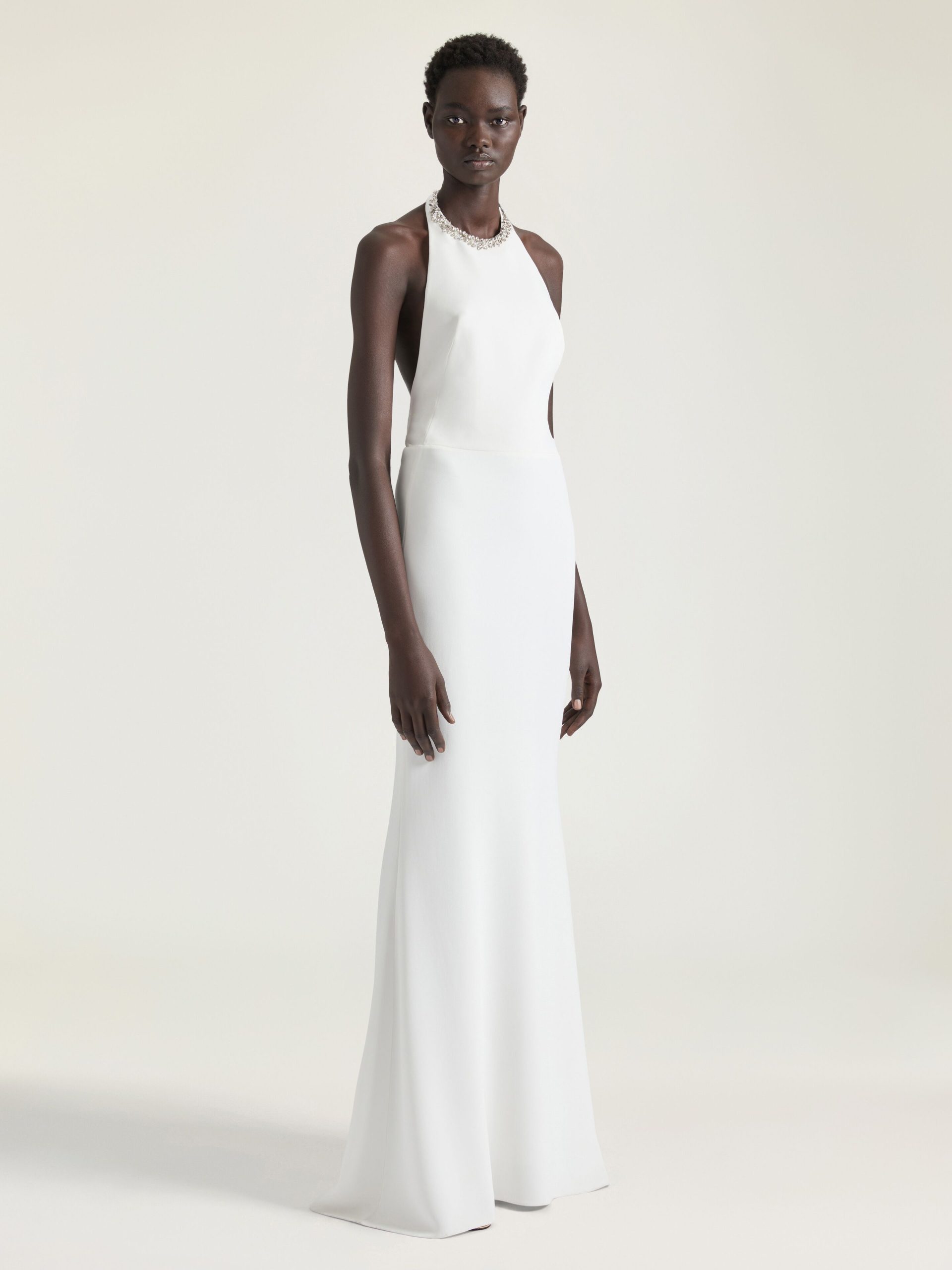 - Invisible zipped closure on the back and hook at neck.