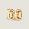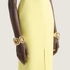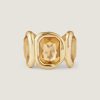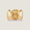 - Large cuff bracelet in golden-finish metal with colored crystals.