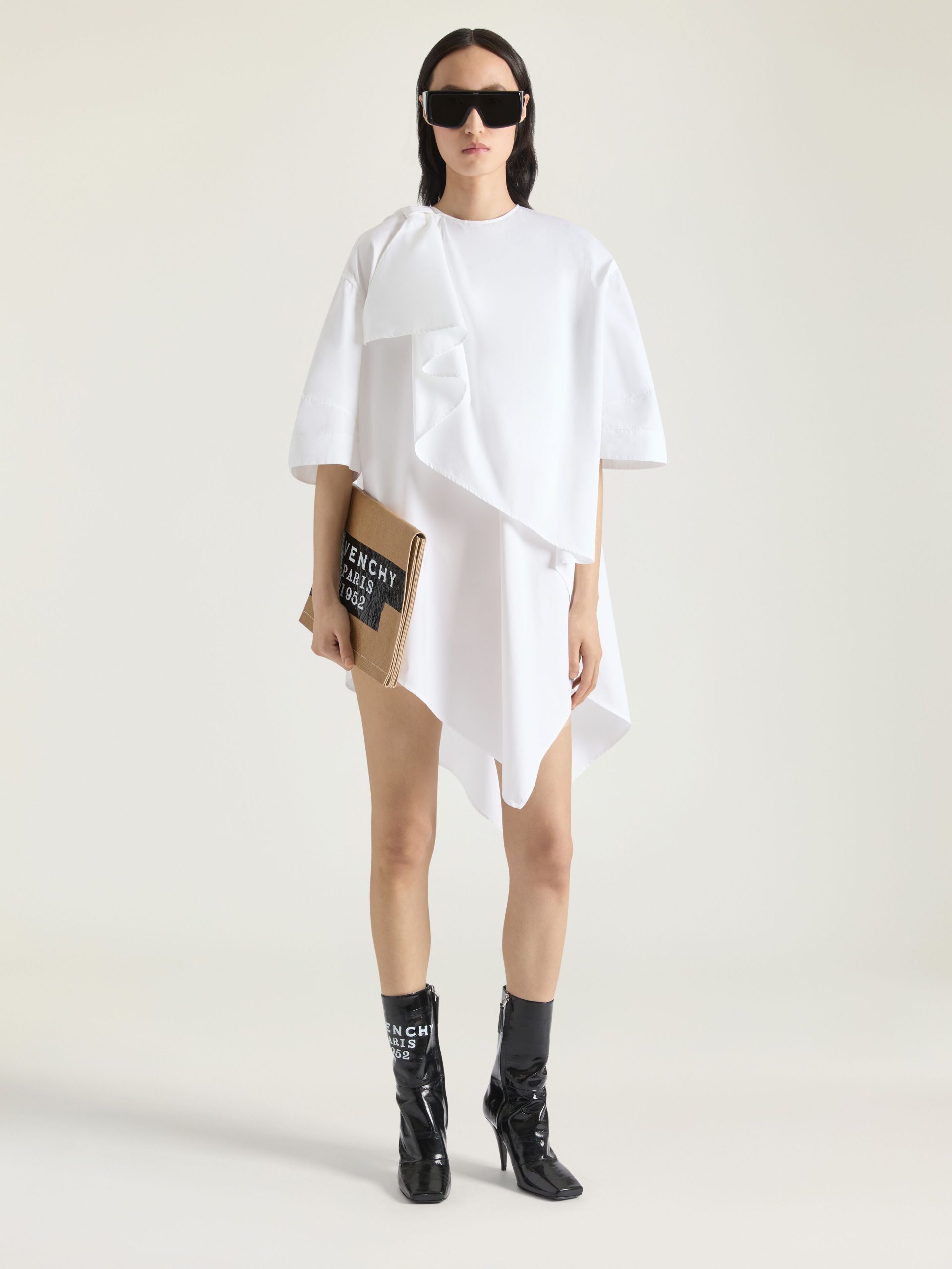 - Raw finishes with pulled threads and irregular stitching evoking rediscovered kraft envelopes that held the patterns from Hubert de Givenchy’s first collection.